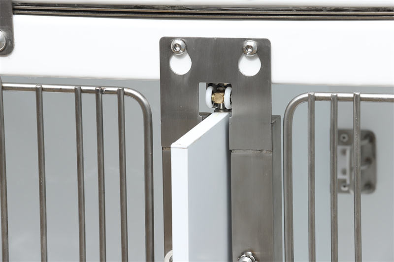 Τα προεγκατεστημένα ακροφύσια και εύκαμπτοι σωλήνες ψεκασμού, ένα σύστημα αποστράγγισης με φίλτρο και πρίζες το μετατρέπουν από απλό κλωβό σε πολυλειτουργικό σταθμό εργασίας. Ηλεκτρικός εξοπλισμός όπως μηχανήματα αναισθησίας, συμπυκνωτές οξυγόνου και θερμαντικά επιθέματα μπορούν να συνδεθούν στις πρίζες και να αναρτηθούν από την κεντρική εγκάρσια ράβδο της πόρτας. Η μπροστινή πόρτα του Veterinary Waterproof Fiberglass Modular Dog Cage επιτρέπει την εγκατάσταση σκίαστρων μέσω στροφών σχήματος U, εμποδίζοντας το ηλιακό φως ενώ χρησιμεύουν ως φράγμα ανέμου.